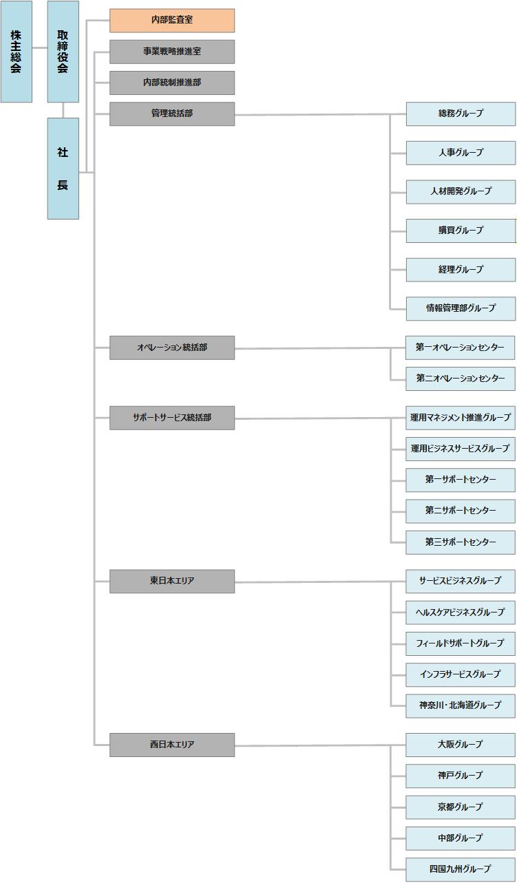都築テクノサービスは、代表取締役を頂点とした明確な統制体制のもと、各エリアが連携しながら、サービスの提供から施工・品質管理・経営管理までを一貫して担っています。