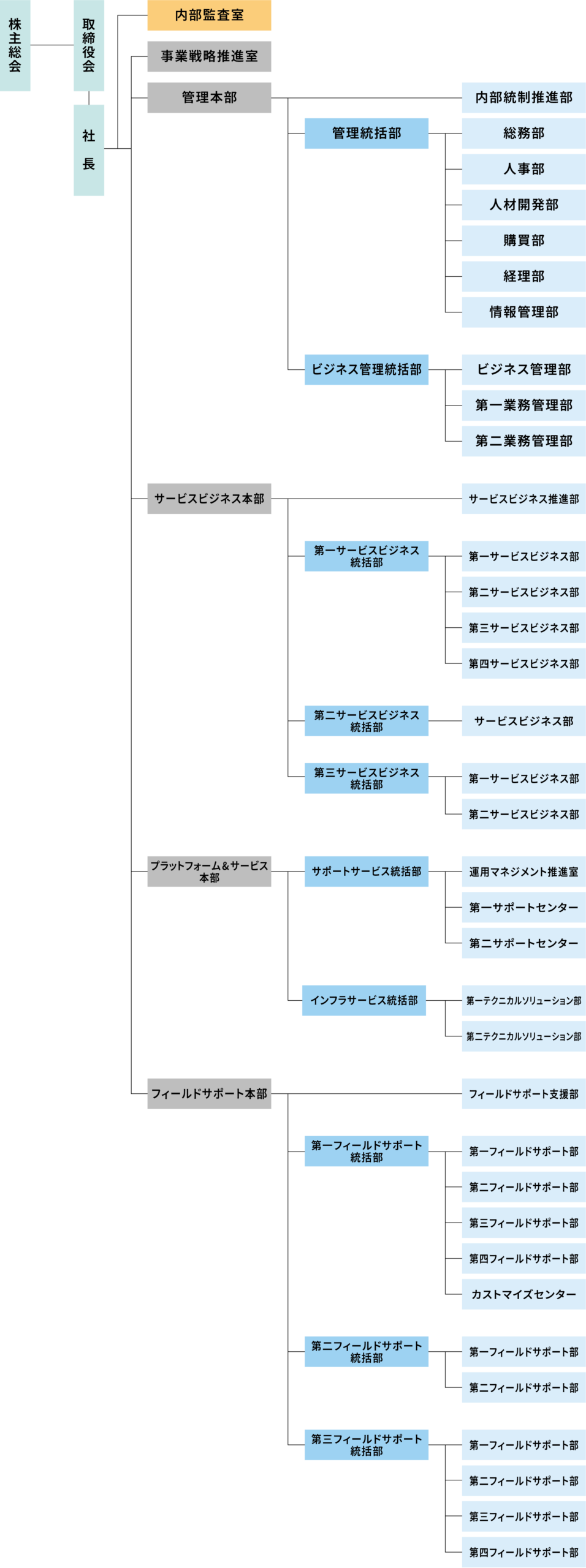 都築テクノサービスは、代表取締役を頂点とした明確な統制体制のもと、サービスビジネス本部・プラットフォーム&サービス本部、フィールドサポート本部、管理本部が連携しながら、サービスの提供から施工・品質管理・経営管理までを一貫して担っています。